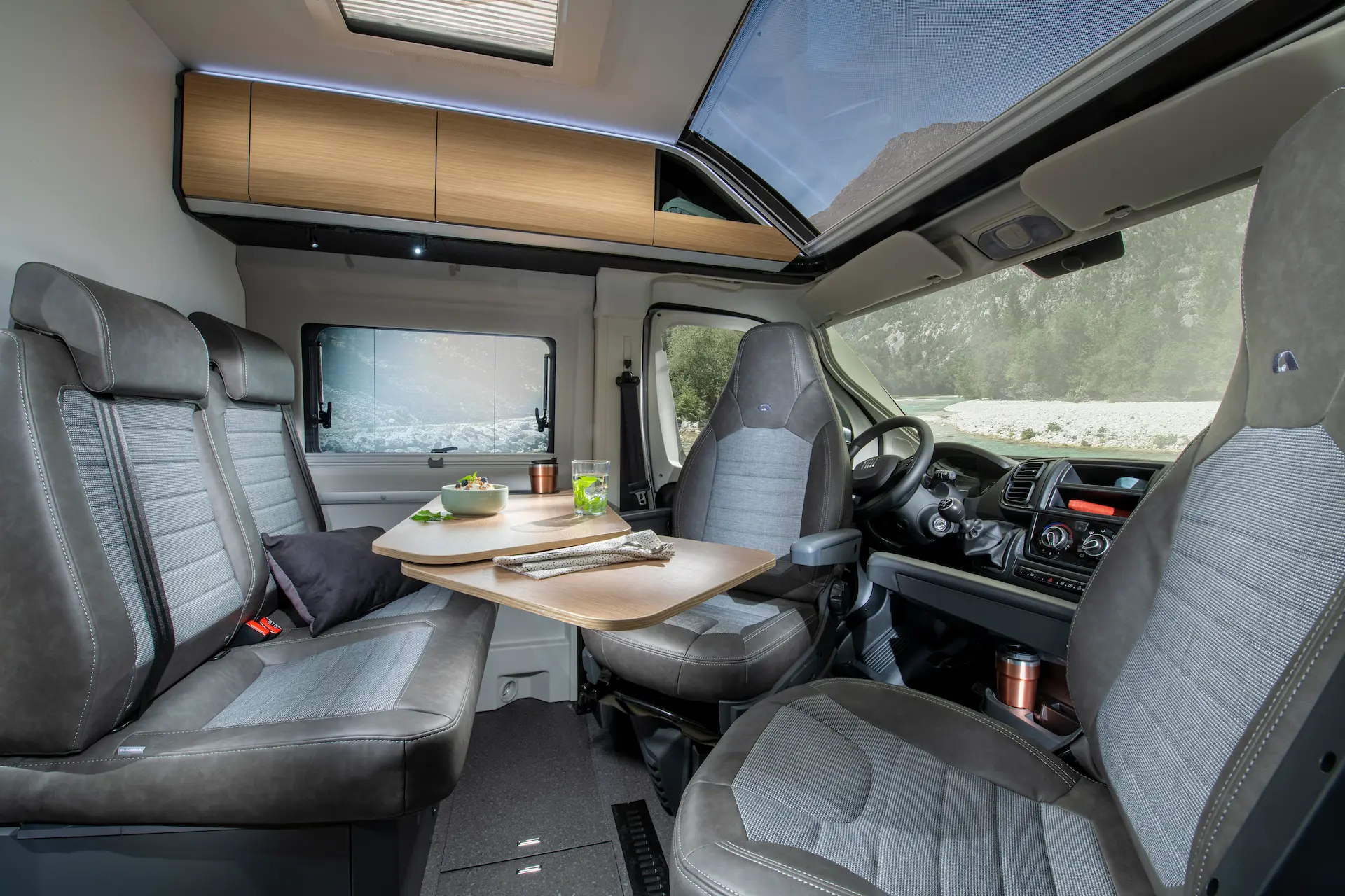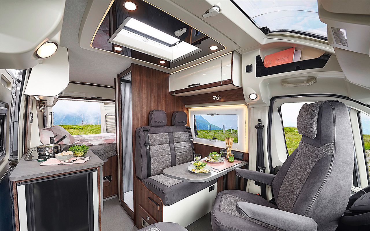 In de basis lijken de Summit 540 en Summit Prime 540 op elkaar. Toch zijn er verschillen! Beide modellen zijn voorzien van de slimme ‘room-in-room’ oplossing waardoor de douche in een handomdraai te realiseren is middels de zwenkwand. Ook is het bed achterin bij het hoofdeinde zo’n 10 centimeter breder. Echter, de Pössl Summit Prime 540 onderscheidt zich door het toegevoegde skyroof boven de cabine, wat zorgt voor een ruimtelijk gevoel en prachtige lichtinval. De interieurkleur is donker hout en er is gebruik gemaakt van mooie indirecte verlichting in het interieur. Optioneel kan er af fabriek een 5e zitplaats worden besteld, die uitneembaar is wanneer niet in gebruik.