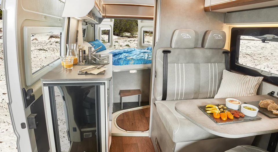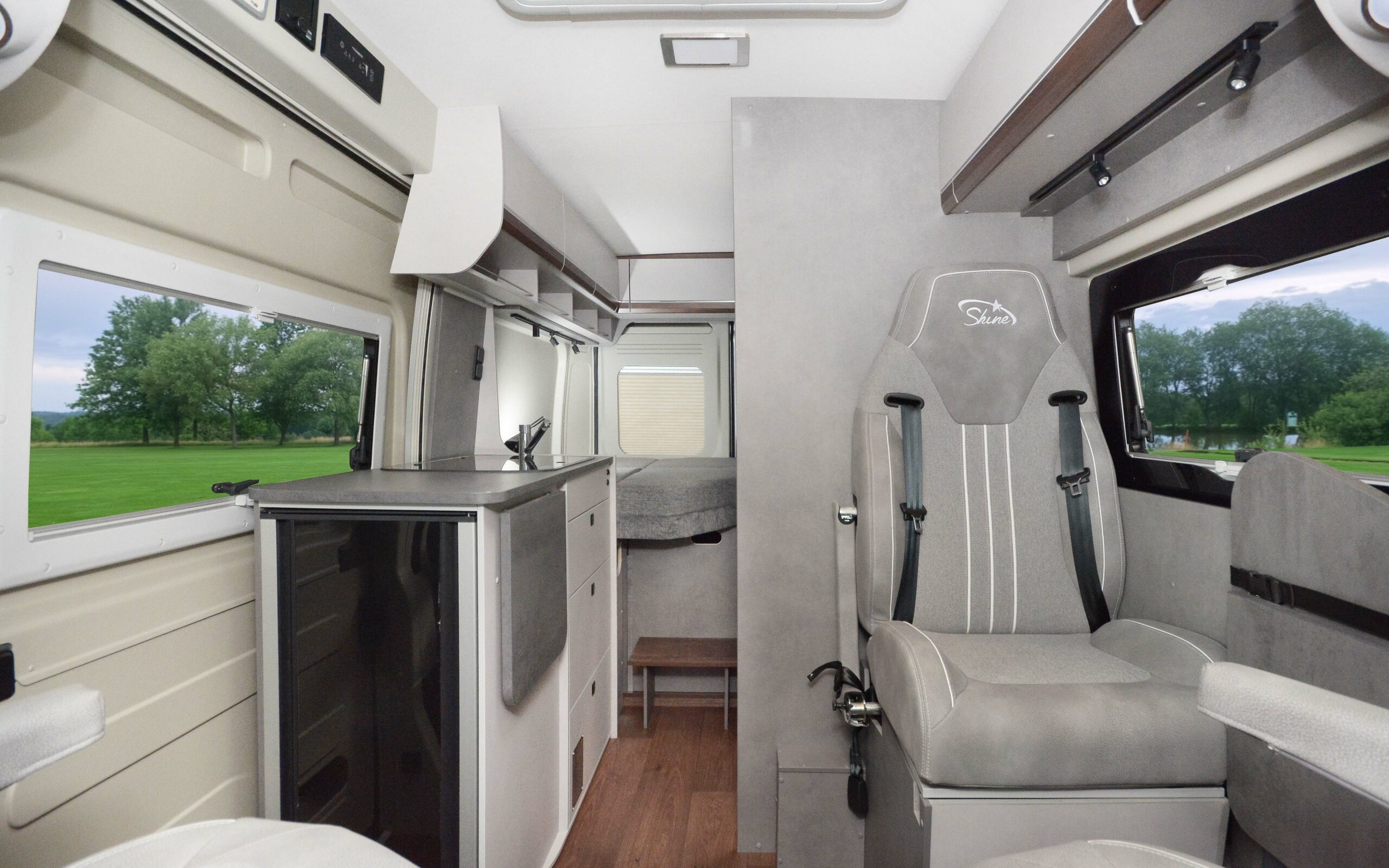 Ontdek de slimme snufjes van de Summit Shine 540! Met een vast bed achterin, een keukenblok inclusief opklapbaar werkblad en een natte cel met douche en toilet biedt deze camper alles wat u nodig heeft. Boven de cabine pronkt een multiroof plank waarmee u het hele jaar door kunt kiezen voor extra opbergruimte of een ruimtelijk gevoel door de plank op te klappen of te verwijderen. In de Shine-modellen kunt u optioneel een vaste zitplaats kiezen in plaats van het tweepersoonsbankje voor extra bewegingsruimte. Voeg een skyroof boven de voorstoelen toe voor prachtige lichtinval of bestel een 5e (uitneembare) zitplaats bij. De lichtgrijze interieurkleur en mooie indirecte verlichting creëren een sfeervolle ambiance.