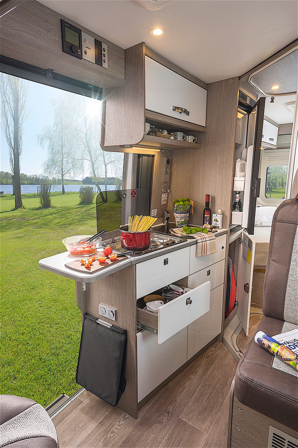 De keuken van de Roadcruiser Evolution combineert compactheid met functionaliteit. Dankzij het opklapbare werkblad creëert u in een handomdraai extra ruimte wanneer u die nodig heeft. De ruime lades zijn groot genoeg om al uw keukengerei netjes op te bergen, zodat alles binnen handbereik is.