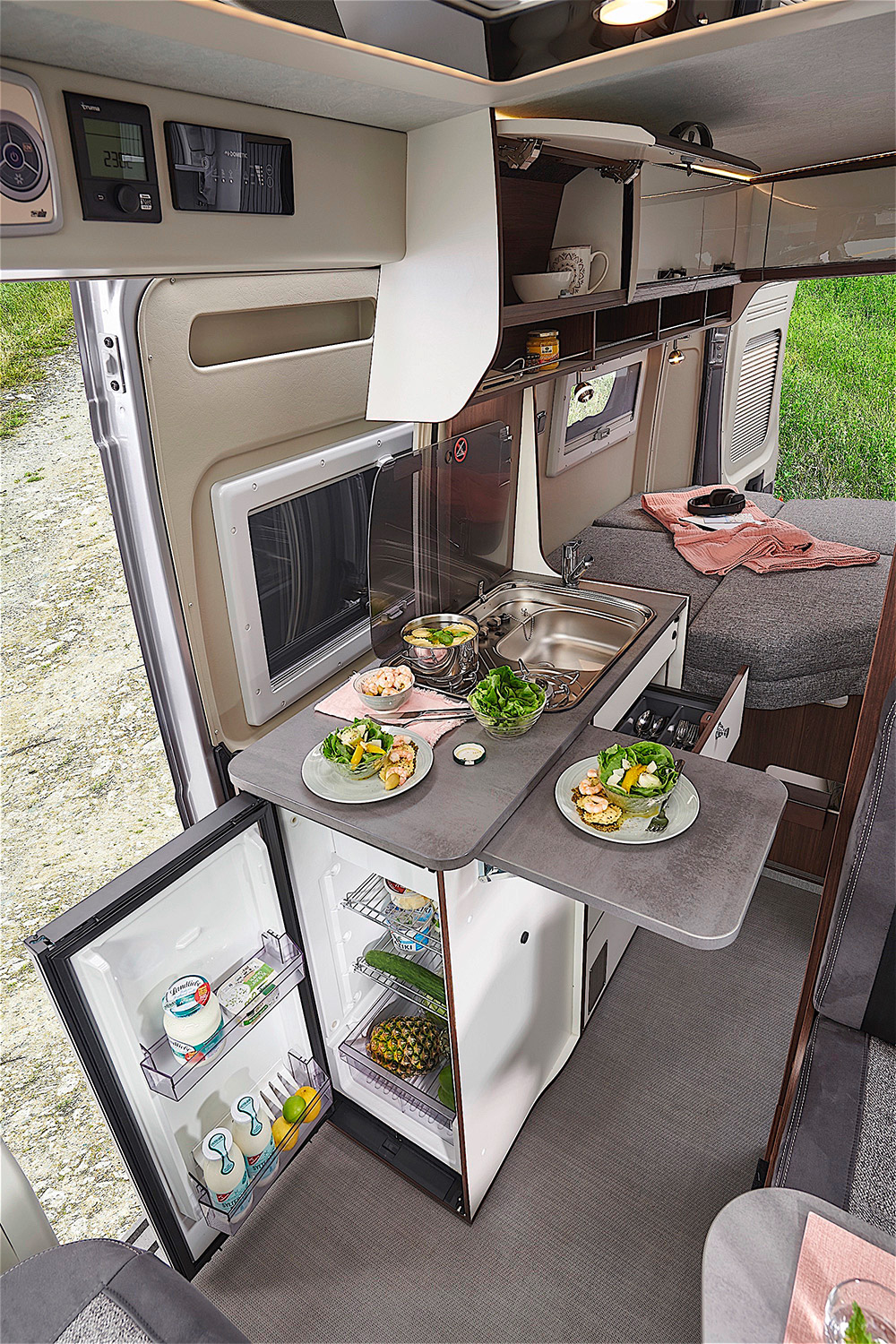 - De koelkast kan in beide richtingen geopend worden en biedt flexibiliteit van zowel binnen als buiten de buscamper.