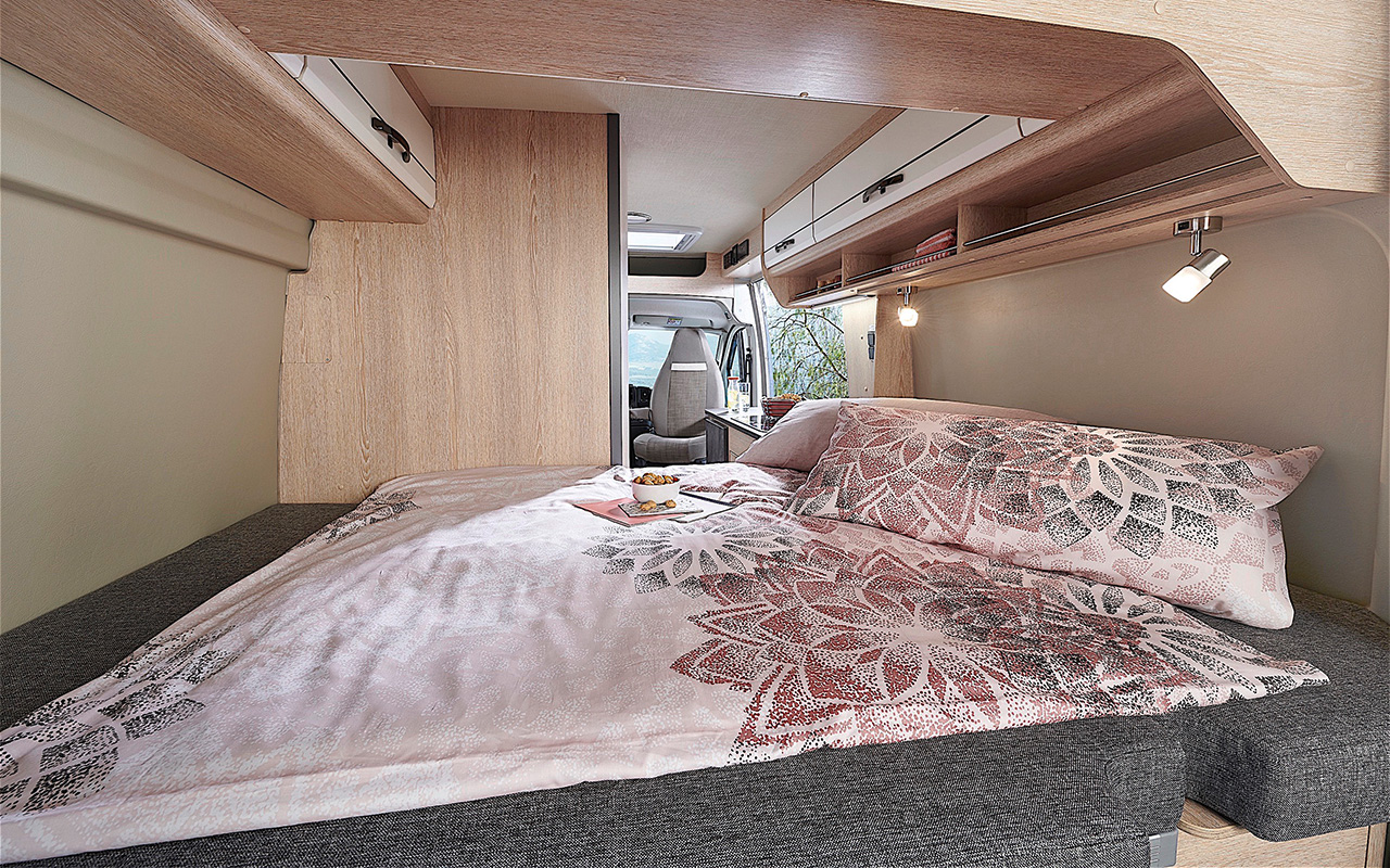 Het is comfortabel slapen in de Summit 540 dankzij het grote tweepersoons dwarsbed achterin. Dit ruime bed biedt volop comfort en zorgt voor een heerlijke nachtrust, zodat u volledig uitgerust aan uw volgende avontuur kunt beginnen.