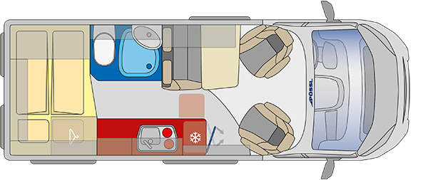 Een dwarsbed achterin de camper bespaart ruimte, waardoor de zitgroep, keuken en wc ruimer aanvoelen. Een dwarsbed is beschikbaar in een 5,41 en 5,99 meter model. De lengte van het bed is 1,96 meter.