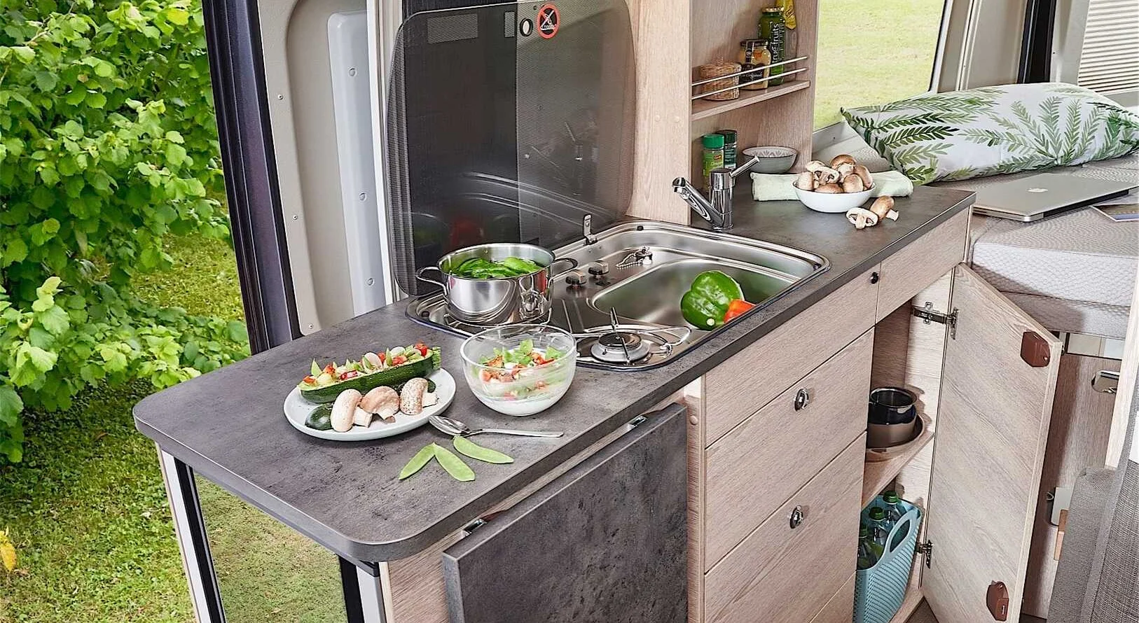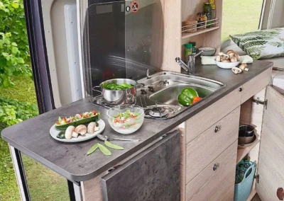 De Summit 600 B is uitgerust met een slim ingedeeld keukenblok waarin alles binnen handbereik is. Het tweepits kooktoestel met piëzo-ontsteking biedt direct gemak, terwijl de glasafdekking extra werkruimte creëert. Onder het werkblad zorgen ruime lades voor overzichtelijke opbergruimte en de geïntegreerde koelkast met vriesvak houdt uw producten vers, zowel van binnen als van buiten bereikbaar. Zo kookt u onderweg net zo comfortabel als thuis.
