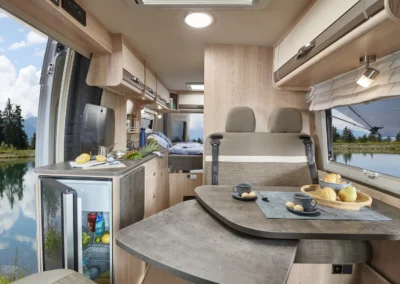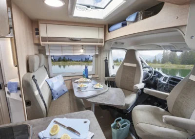 De Summit 600 B biedt een royale zitgroep met ergonomische kussens en draaibare cabinestoelen voor optimaal comfort. De ruime tafel kan optioneel worden uitgerust met een draaibaar blad voor extra flexibiliteit. Dankzij de slimme indeling ontstaat een gezellige en praktische leefruimte, perfect om te ontspannen, te dineren of plannen te maken voor uw volgende reis.