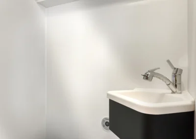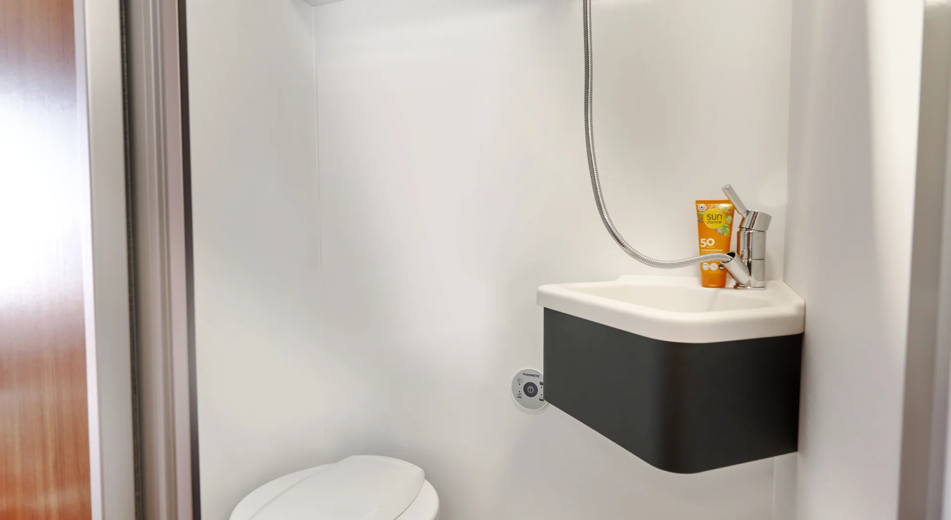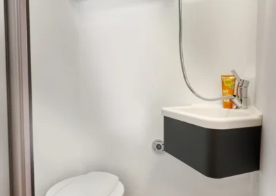 Dankzij de nieuwe houten wc/doucheruimte beschikt u over een ruim toilet. Wanneer u wilt douchen, draait u de wand moeiteloos om, waardoor de wastafel en het toilet beschermd blijven tegen spatwater. Zo geniet u van maximaal comfort, zonder concessies aan ruimte of functionaliteit.
