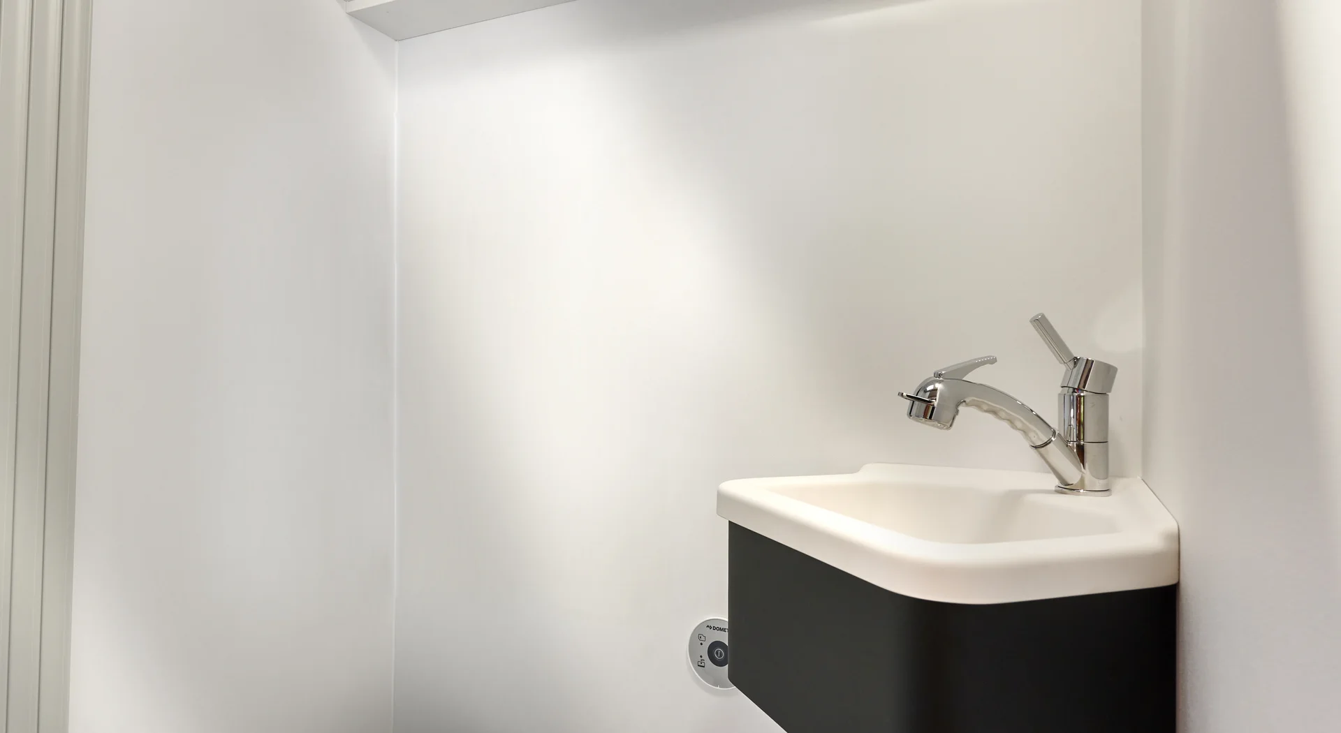 De draaibare zwenkwand in de natte cel maakt douchen eenvoudig en efficiënt. Optioneel verkrijgbaar met een handig opbergvakje via het sanitairpakket.