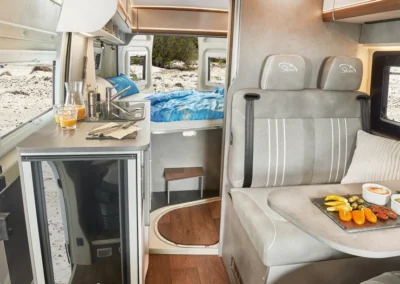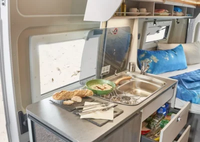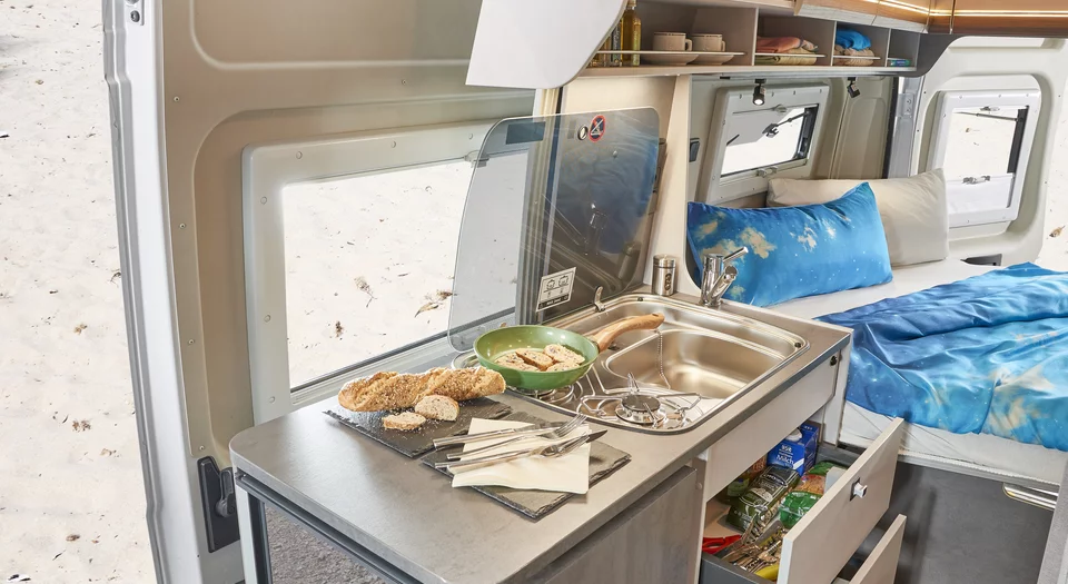 De keuken is voorzien van een moderne compressor koelkast met scharnieren aan beide zijden, waardoor deze zowel van binnen als buiten de camper eenvoudig toegankelijk is. Dit slimme en doordachte ontwerp biedt extra gebruiksgemak, zodat u altijd moeiteloos bij uw etens- en drinkwaren kunt.