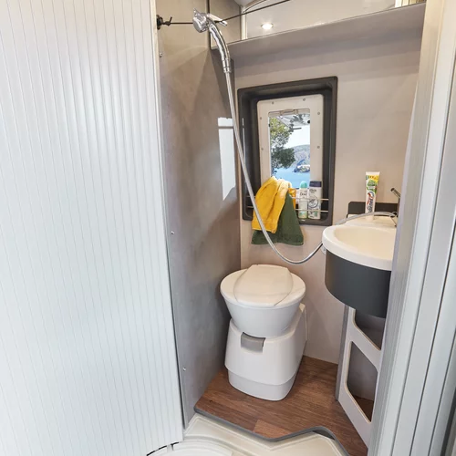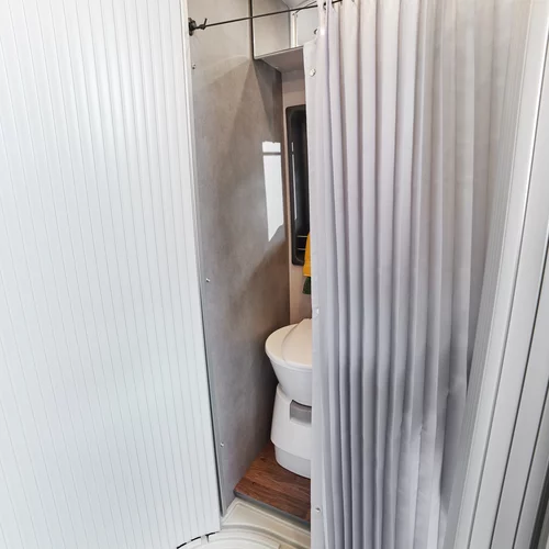 De ruimedouche met geïntegreerd toilet biedt optimaal comfort tijdens uw reis. Dankzij de slimme rollo-oplossing ontstaat er een volwaardige douchecabine, die tevens dienstdoet als roomdivider. Zo profiteert u van extra privacy én een efficiënt gebruik van de beschikbare ruimte.