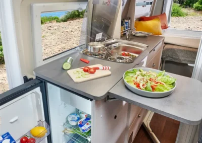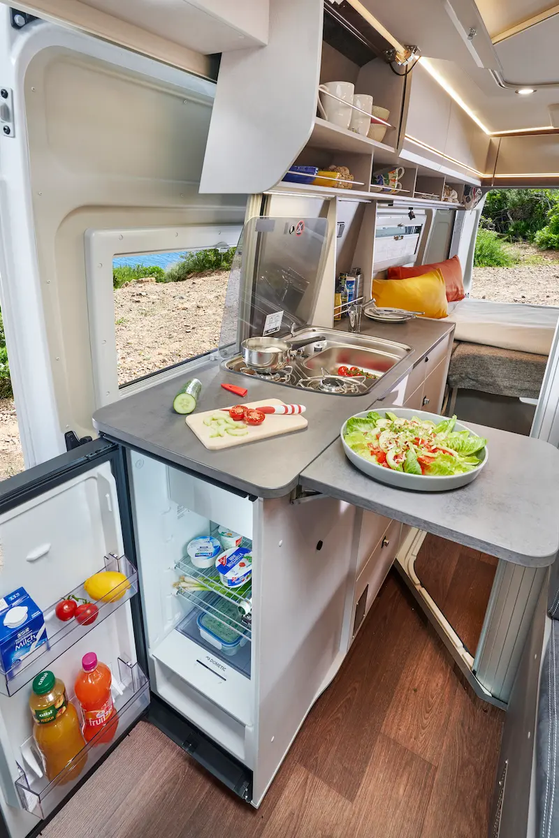 De Summit Shine 600 R biedt u een doordacht ingerichte keuken waarin koken onderweg extra comfortabel wordt. Het brede keukenblok is voorzien van een praktisch uitklapbaar werkblad, waardoor u eenvoudig meer ruimte creëert om maaltijden te bereiden. De koelkast bevindt zich slim geplaatst aan de kopse kant en is van zowel binnen als buiten te openen – ideaal tijdens een picknick of een warme zomerdag. Dankzij de slimme indeling en voldoende opbergruimte houdt u alles overzichtelijk bij de hand, zodat u ook tijdens uw reis kunt genieten van gemak en kookplezier.