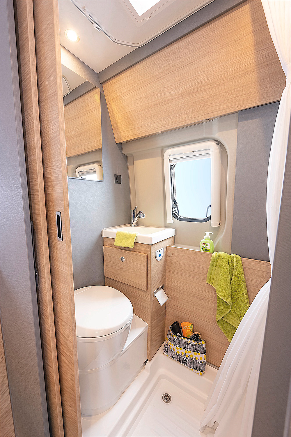 • Trenta 600 beschikt over een praktische en ruimtebesparende houten schuifdeur voor de wc/doucheruimte