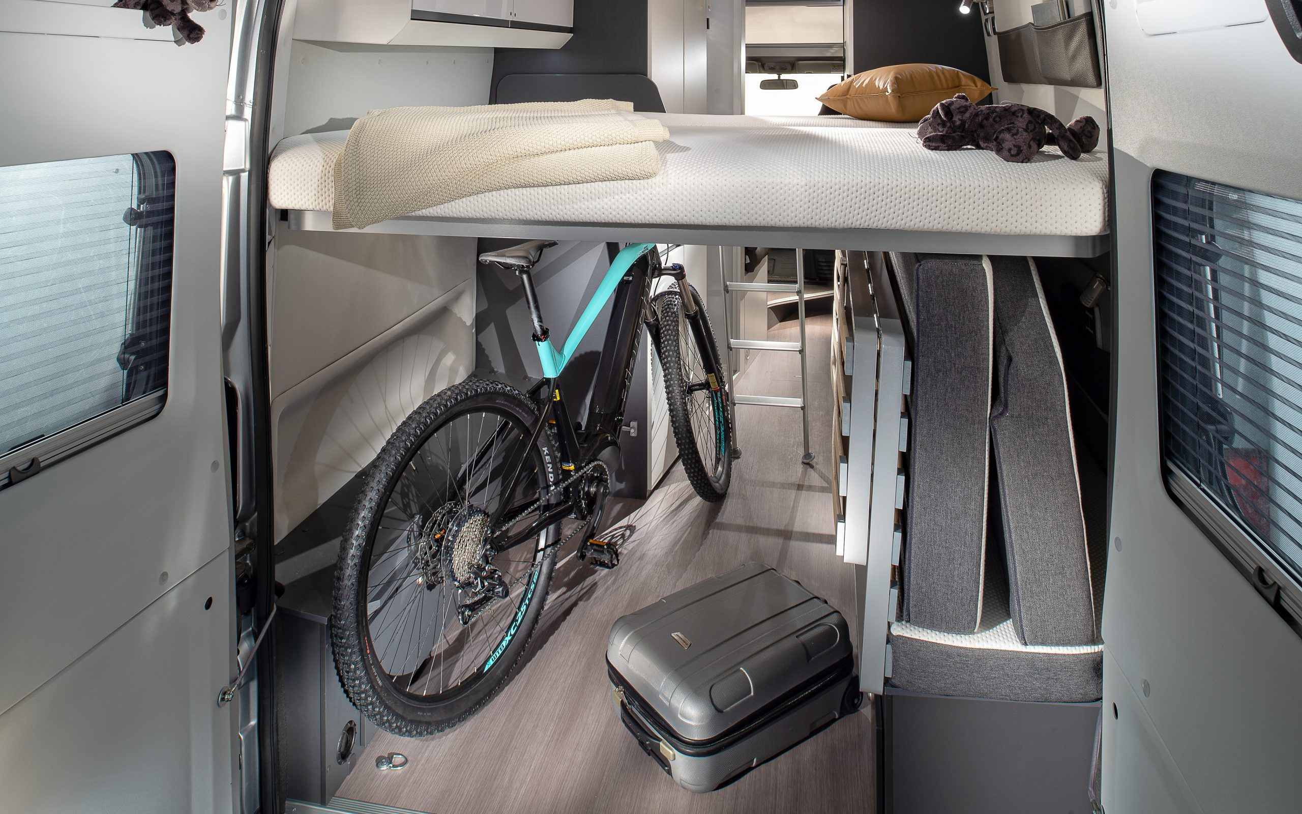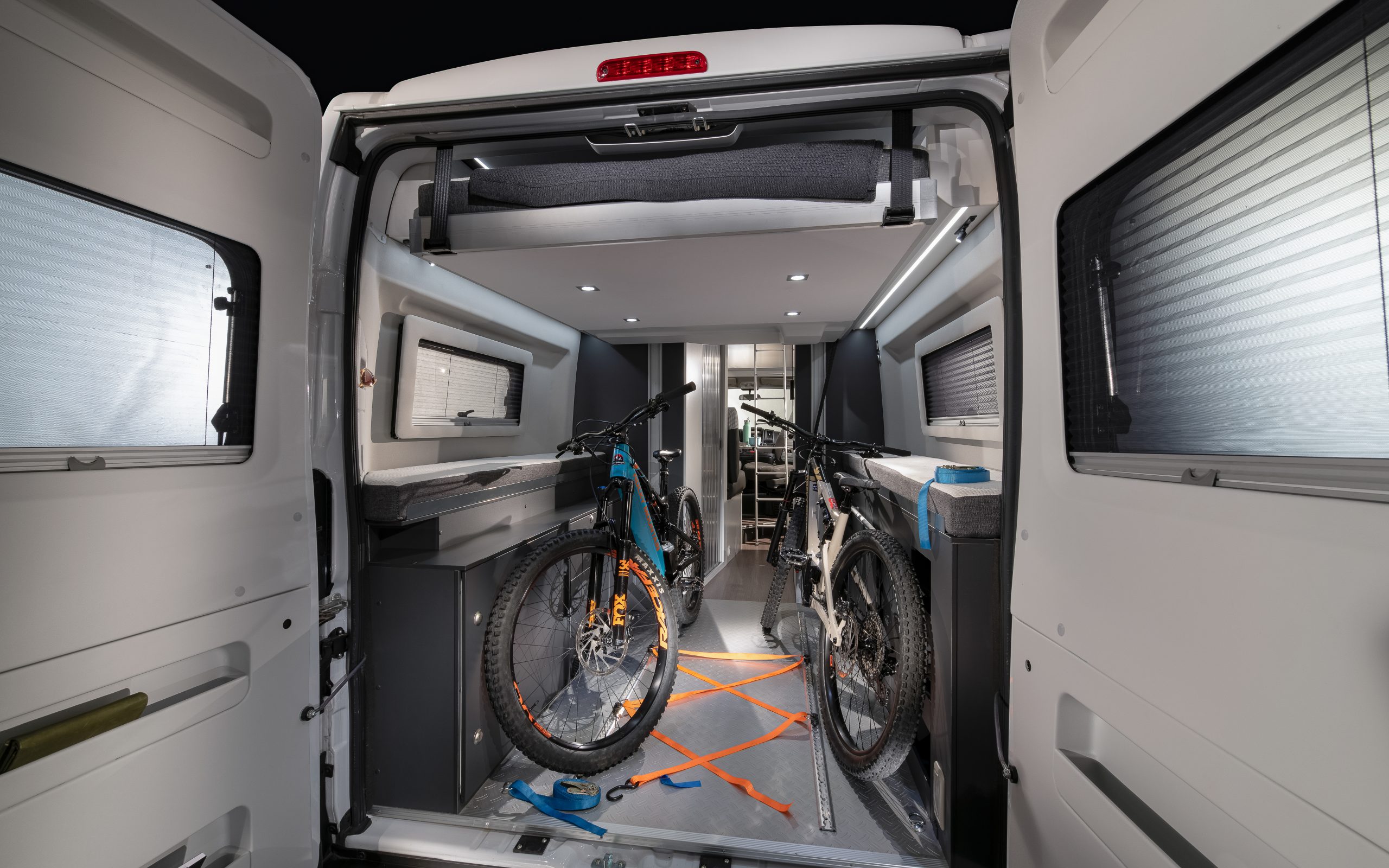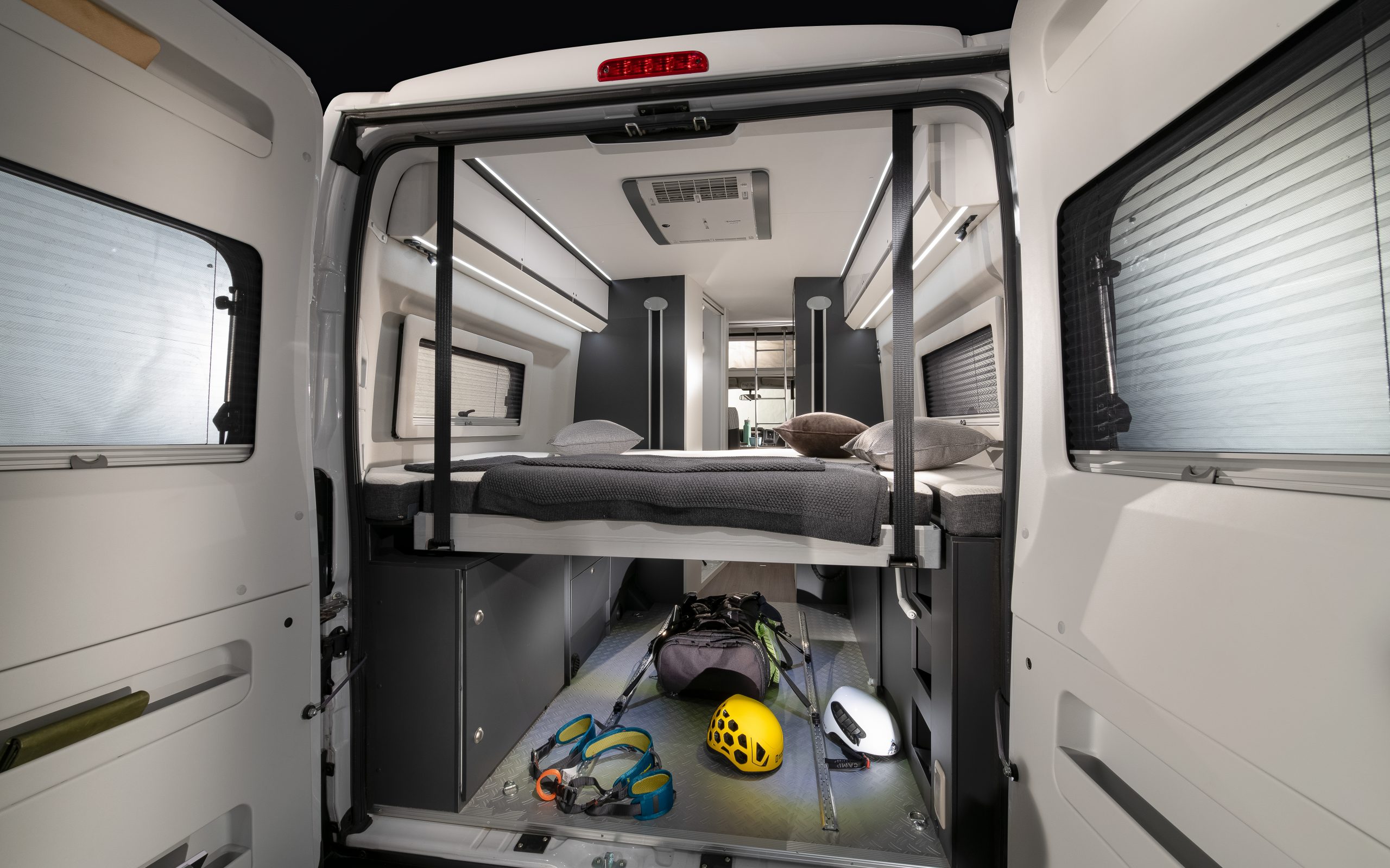 - Twee extra slaapplaatsen in het pop-up dak (200 × 130 cm) met horren, ventilatie en geïntegreerde verlichting