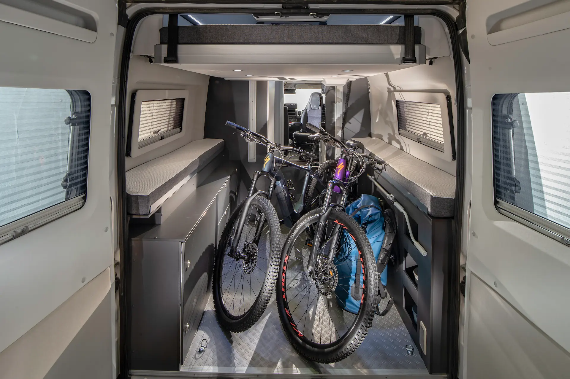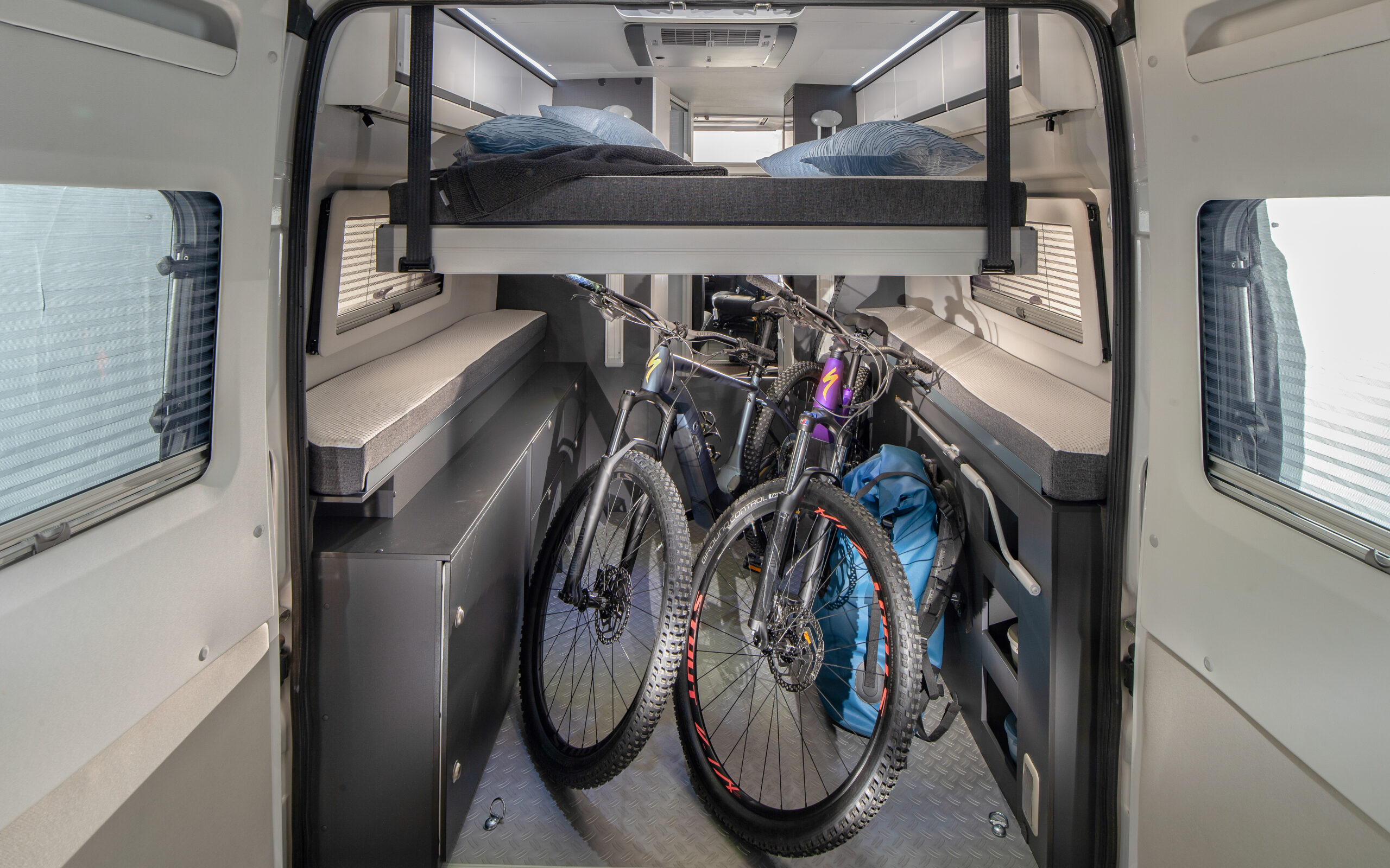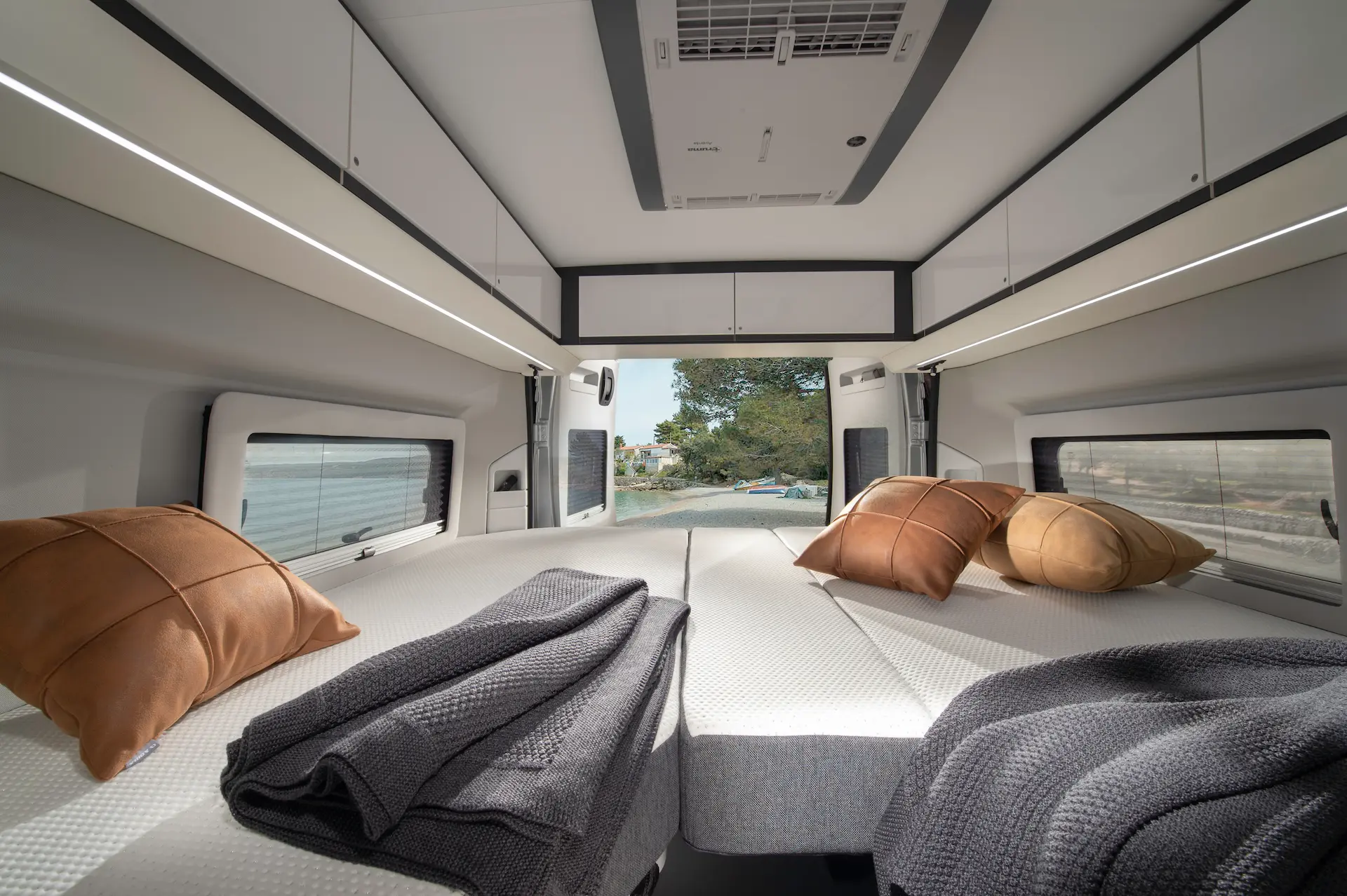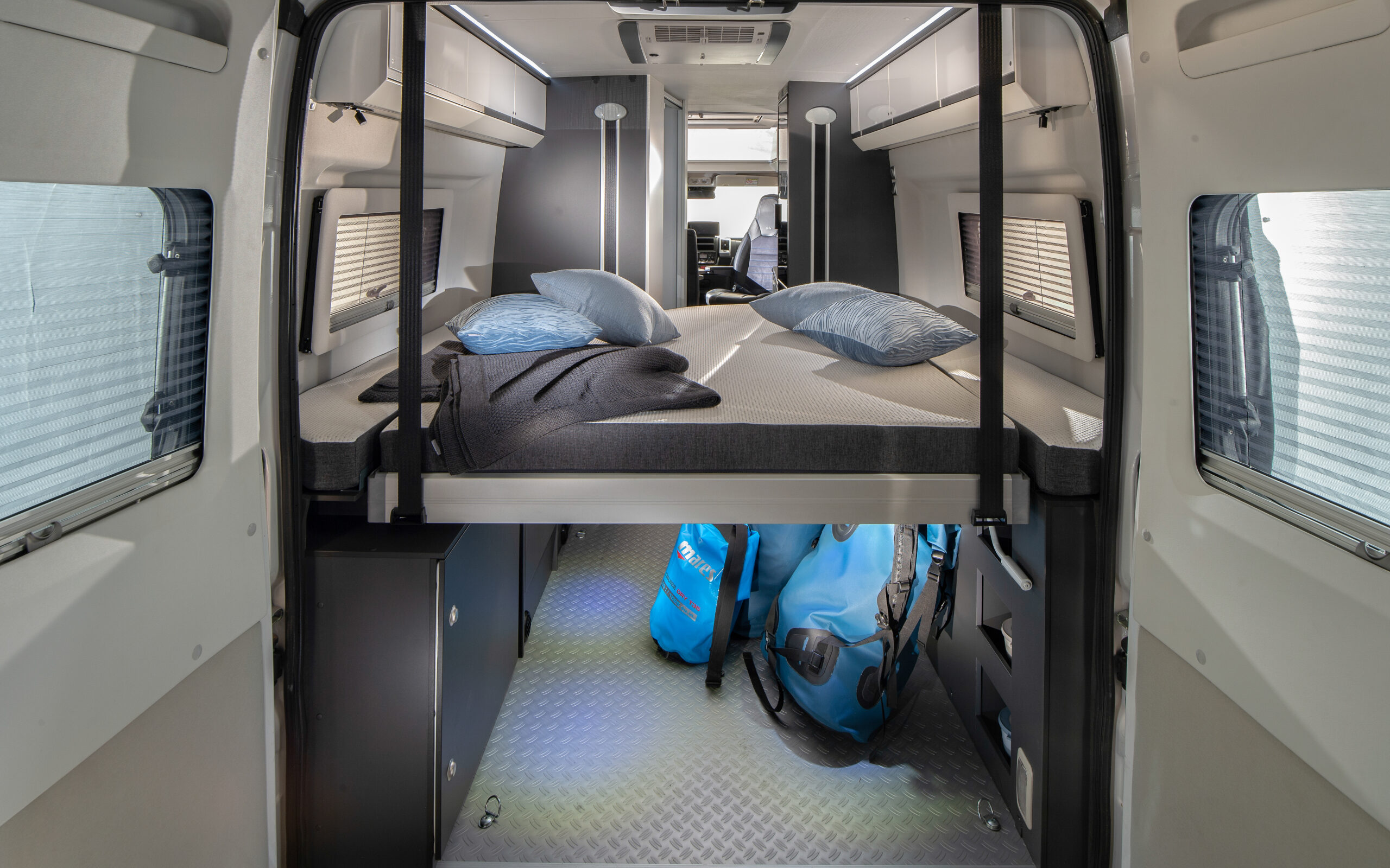Achterin vindt u het elektrisch verstelbare hefbed (190 x 185/172 cm). Wanneer het bed omhoog staat, creëert u een enorme laadruimte – perfect voor fietsen, sportmateriaal of grote bagage. Dankzij de stevige lattenbodem en het comfortabele matras is ook uw nachtrust goed geregeld.