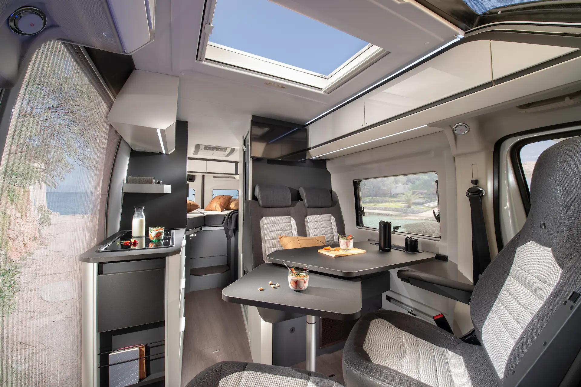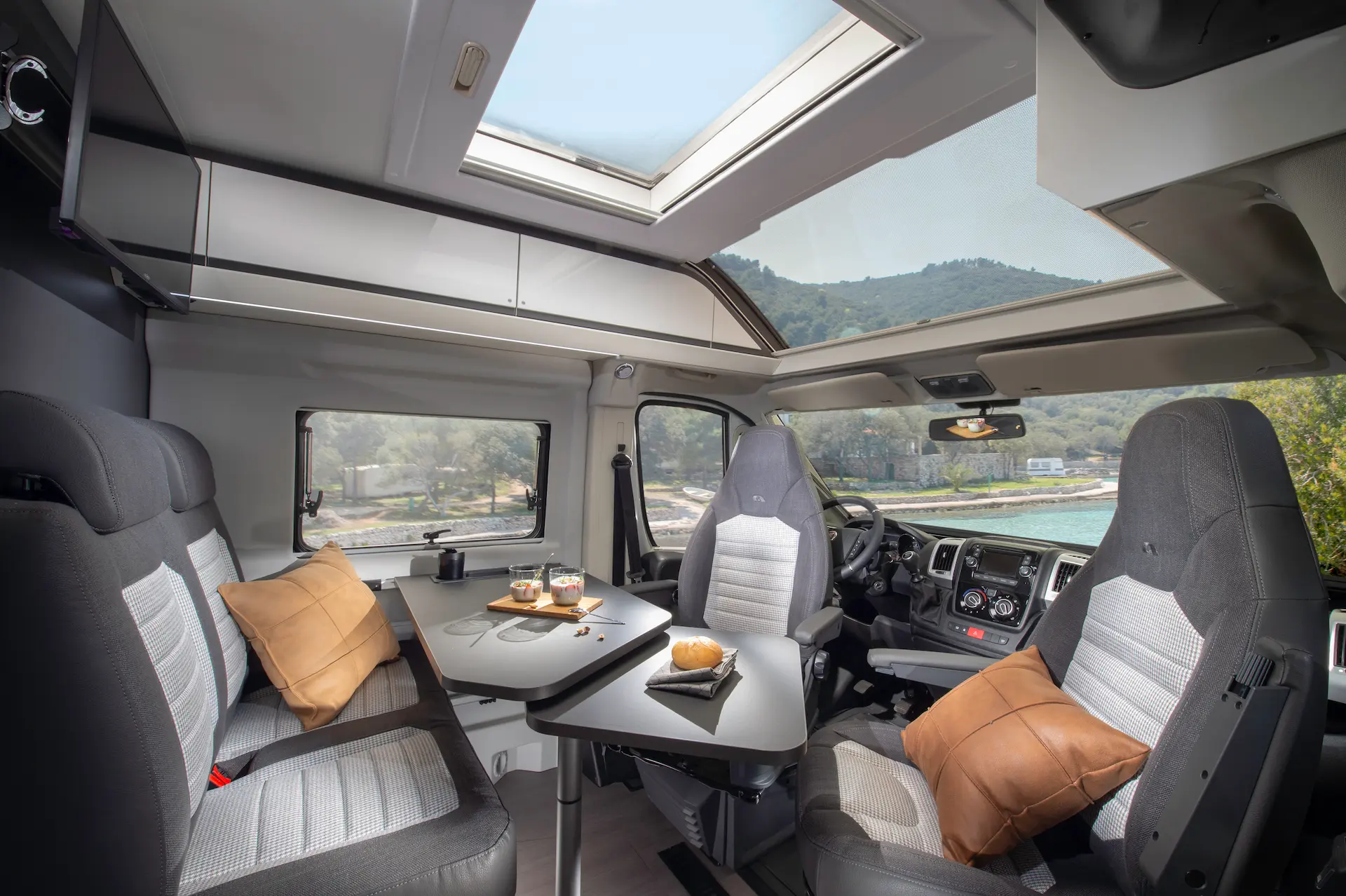 De Twin Supreme 640 SGX biedt een moderne en flexibele leefomgeving. De leefruimte ademt rust en licht dankzij het open loft-ontwerp en het panoramische dakvenster. De zitgroep is comfortabel ingericht met ergonomische stoelen en een verplaatsbare tafel – perfect om te eten, werken of ontspannen.