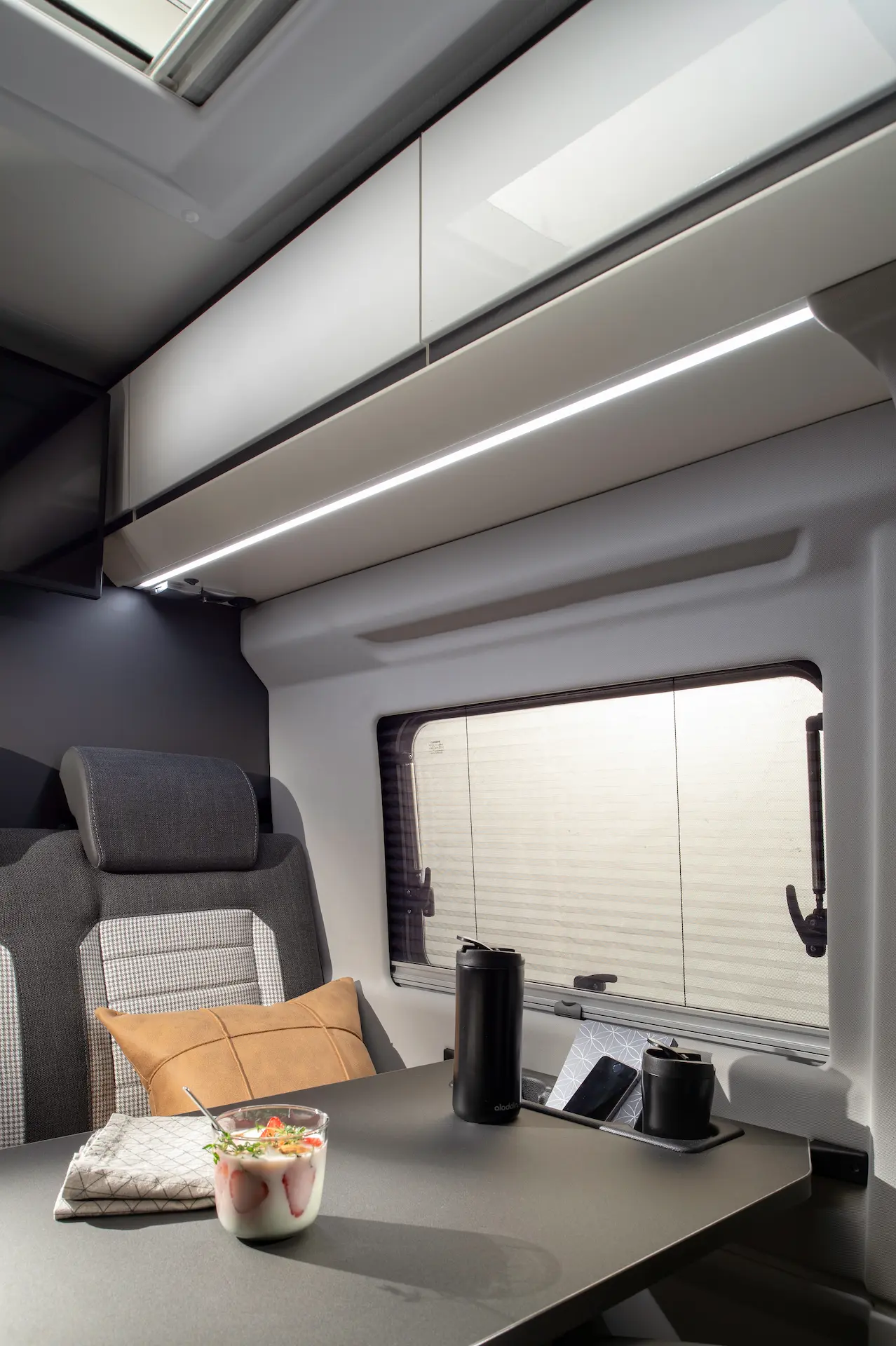 De keuken is voorzien van alles wat u onderweg nodig heeft: een tweepits gasstel, spoelbak met verlengd werkblad, softclose lades en een ruime compressorkoelkast (87 of optioneel 138 liter). Alles is praktisch ingedeeld en stijlvol afgewerkt.